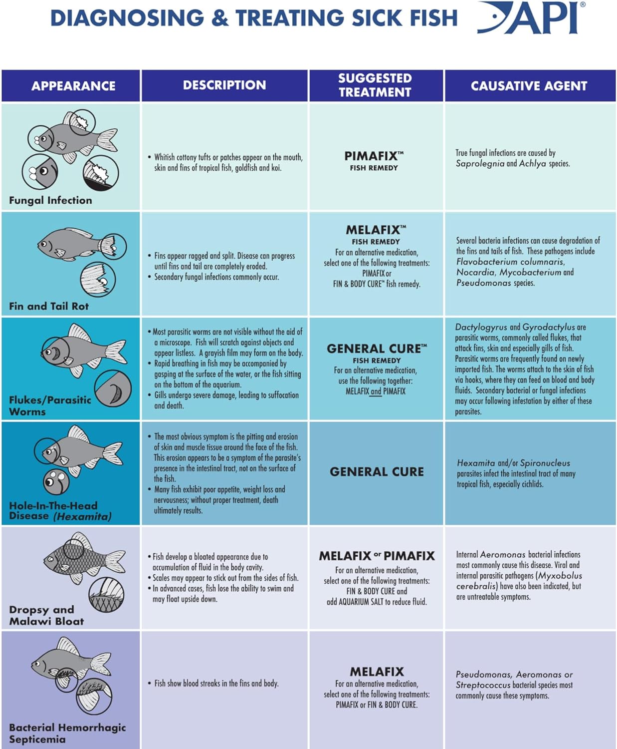 Fast-acting API GENERAL CURE Freshwater and Saltwater Fish Powder Medication treats a wide variety of parasites in fish, including velvet, fish lice, hole-in-the-head disease (Hexamita spp. & Spironucleus), gill & skin flukes (Dactylogyrus & Gyrodactylus ). For use in fresh and saltwater aquariums. This medication will not color the aquarium water. Dose according to directions on product label and use accordingly. With API Aquarium products, it’s easy to keep a beautiful saltwater, freshwater or reef aquarium. For over 50 years, API has been creating innovative, research-driven solutions that make it easier to care for your fish and aquarium. API Aquarium Treatment Supplies are designed to work in conjunction with each other to provide best results to control algae, promote healthy bacterial growth and help control and cure fish diseases and conditions such as ich and fin rot. They work to provide a safe, hospitable environment for fish such as tropical community fish, cichlids, goldfish and more. With API, you can spend more time admiring your fish, and less time scrubbing your tank. Make sure to use all products as directed in order to ensure the best results.