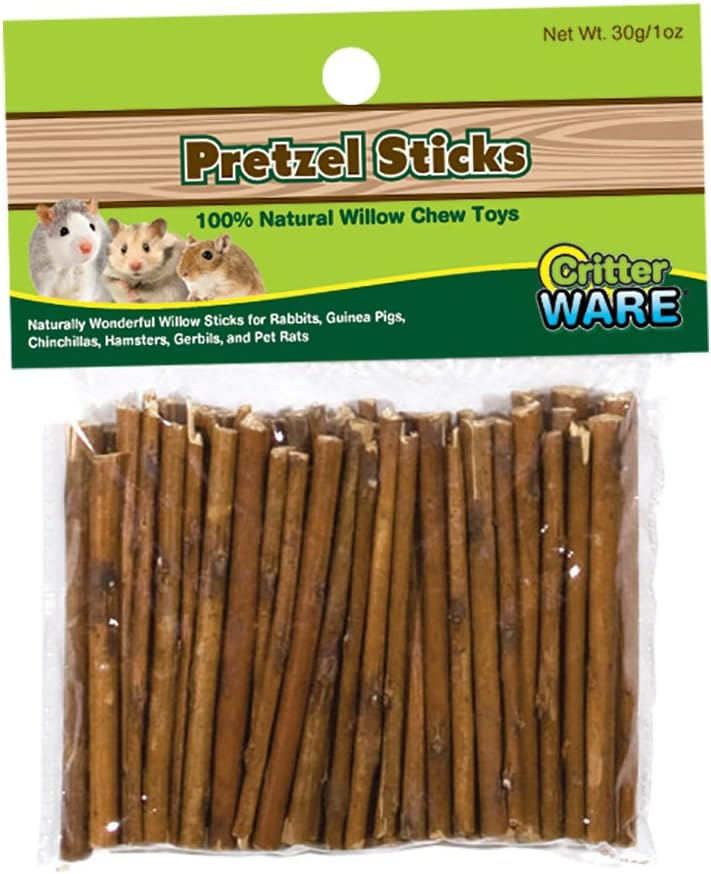 These pretzel sticks are 100 percent natural willow chew treats, offering a flavorful snack for rabbits, guinea pigs, chinchillas, pet rats, hamsters, and gerbils. They are a perfect treat for hand feeding to pets who love wood chews to help trim teeth. Measures 5-inch width by 1-inch depth by 6-1/2-inch height.